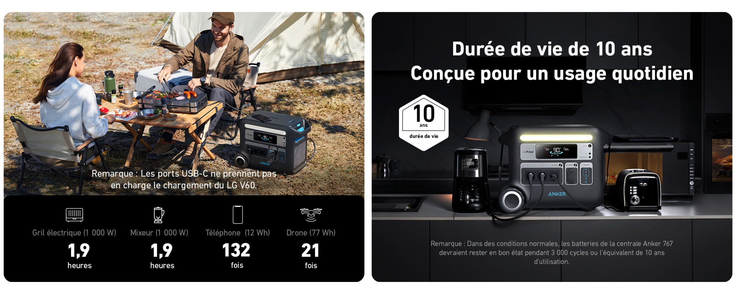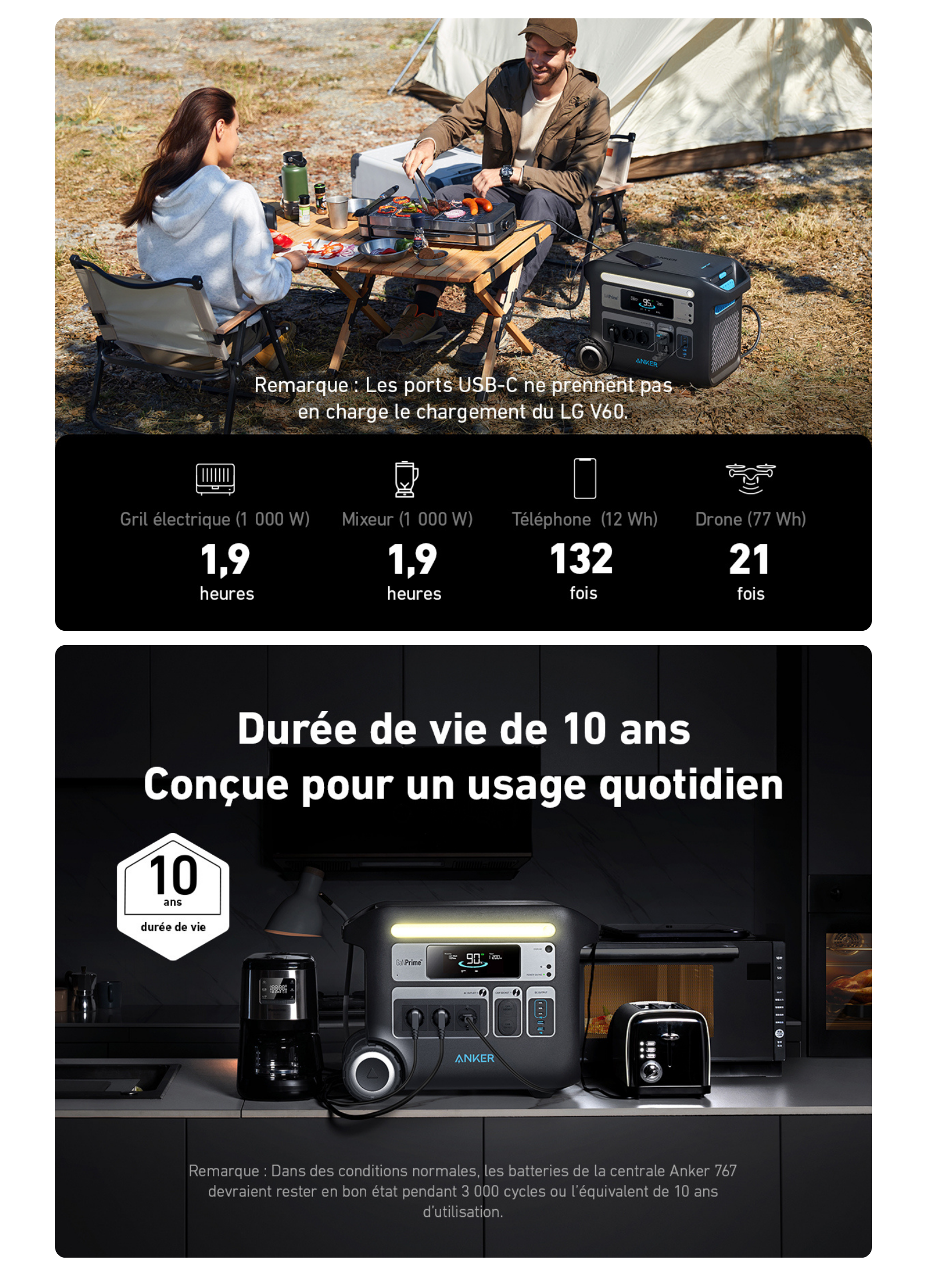 - Centrale électrique portable longue durée de vie (10 ans) : Grâce à notre technologie propriétaire InfiniPower, combinée à des batteries LiFePO4, des composants ultra-durables, un système de contrôle intelligent qui surveille la température jusqu’à 100 fois par seconde, et une conception anti-chocs, Anker PowerHouse 767 est conçu pour durer plus de 10 ans, même en cas d’usage quotidien.